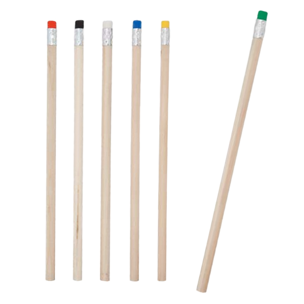 Lápiz de madera de acabado natural. Con cuerpo redondo y goma de borrar -goma disponible en variada gama de colores-. Punta sin afilar.