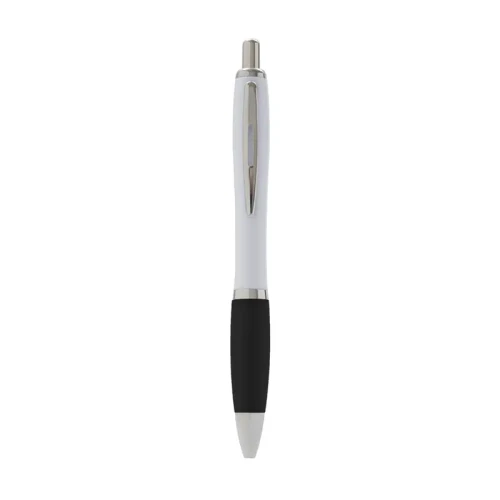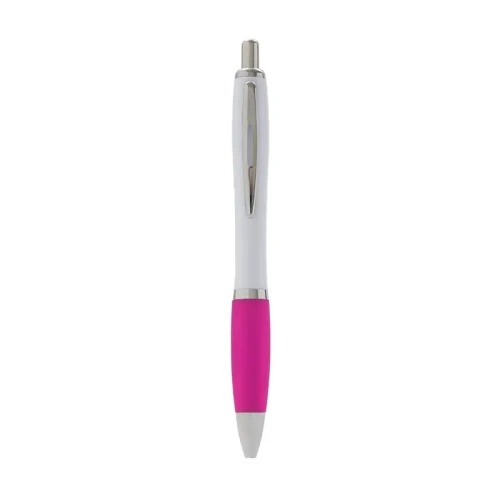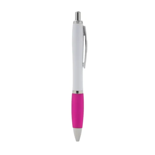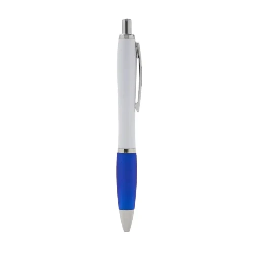 Bolígrafo con cuerpo curvo plástico en acabado blanco. Cuenta con grip de goma de color, clip y botón metálico, mecanismo retráctil y tinta azul. Tahg