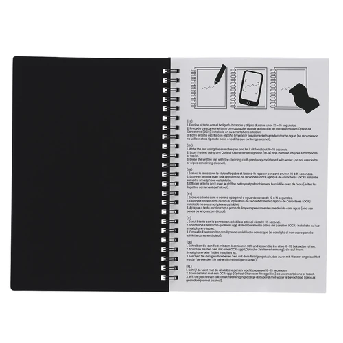 Libreta y bolígrafo borrable con paño limpiador incluido con el que disfrutar de una escritura fluida y dejar margen para el error. Libreta en PP de 18 páginas con anillas metálicas. Bolígrafo de cartucho jumbo y en tinta negra. Permite escribir, borrar y reescribir sin dañar los documentos. Fabricado en resistente ABS de acabado transparente.