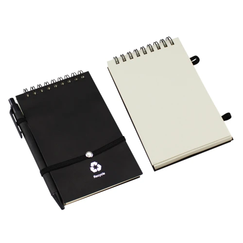 Libreta Ecológica con tapas de cartón reciclado, 70 hojas interiores blancas (croqueras). Incluye cierre elasticado y bolígrafo ecológico.