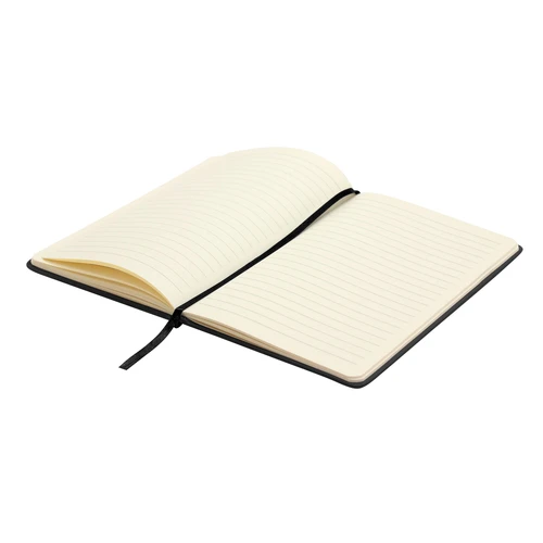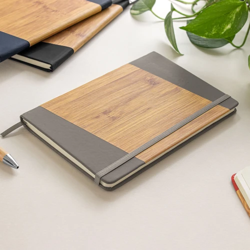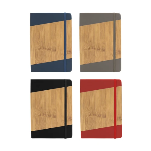 21 x 14 cm. (A5). PU + Papel. Libreta. Tapa dura recubierta en poliuretano, con estampado simil bambú. Interior 80 hojas rayadas en papel de 70 g. Cinta señaladora y cierre con banda elástica del mismo color.