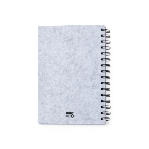 Libreta de anillas con tapas en suave fieltro RPET reciclado. Interior con 100 hojas blancas con disposición a una raya. Incluye distintivo RPET. Presentado en bolsa individual reciclada.El fieltro RPET reciclado es fruto de la combinación del proceso de reciclaje de materiales plásticos junto a la técnica milenaria de fabricación del fieltro, dando como resultado un material de eco-tendencia que, además de ser de origen reciclado, también se convierte en reciclable.