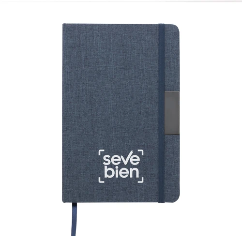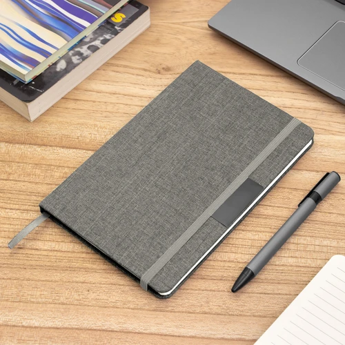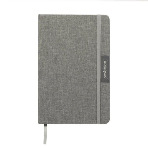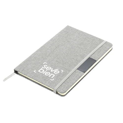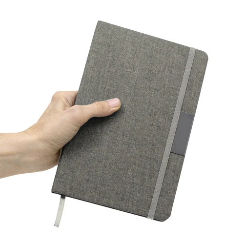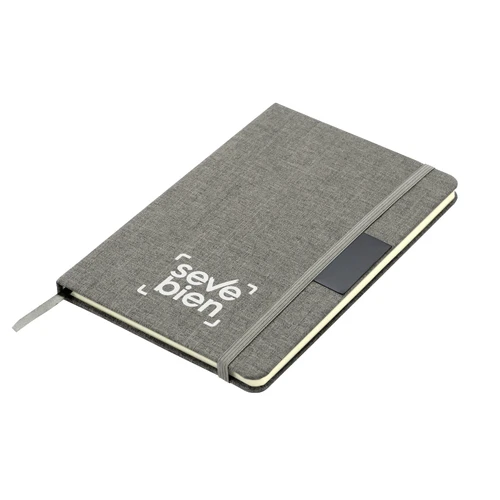 Sostenibilidad elegante.Libreta con placa metálica. Tapa de cartón de 300g recubierta en RPET 310. Placa metálica de 5 x 2 cm. Interior de 80 hojas rayadas en papel obra de 70g. Encuadernación cosida. Cierre con banda elástica del mismo color de la tapa.Medidas: 14 x 21 x 1,5 cm.