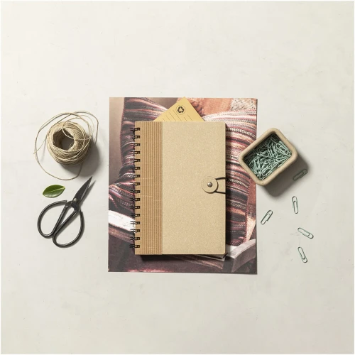 Libreta de anillas A5 de línea nature, con tapas duras en resistente cartón reciclado. 80 hojas con disposición a una raya, de acabado kraft y distintivo reciclado.