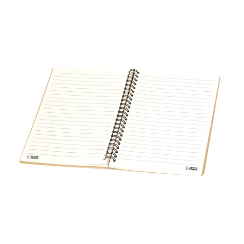 Libreta de anillas dobles metálicas con tapas blandas de cartón con hojas fabricadas a partir de extractos de piedra. Contiene 70 hojas color blanco y disposición a una raya, de elegante acabado de color natural. Logotipo Natural Stone en cada hoja. Incluye hoja interior en la que se explica el proceso de fabricación a partir de extractos de piedra.El material usado en la elaboración de la libreta es 100% reciclable y libre de cloro, con propiedades impermeables, altamente resistente y lavable, convirtiéndose así en una alternativa ecológica y sostenible frente al papel convencional, cuyo origen no es el tradicional ni proviene de los árboles.