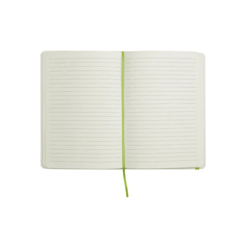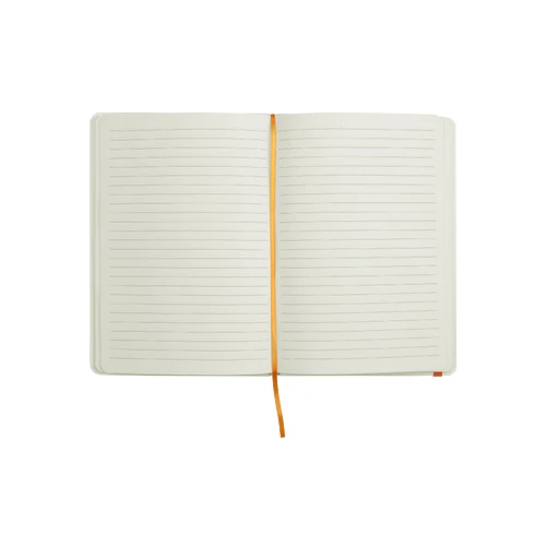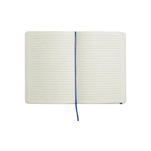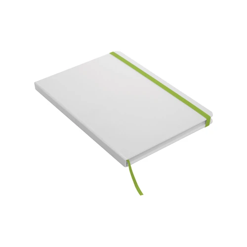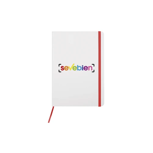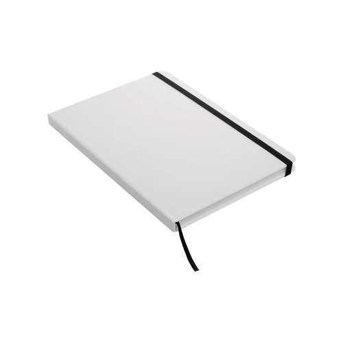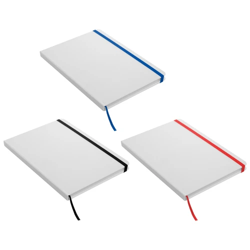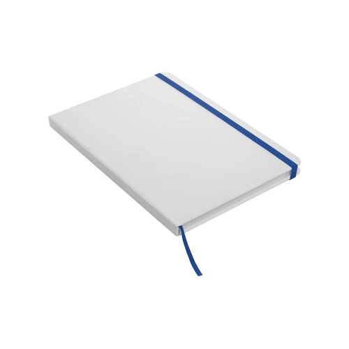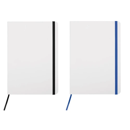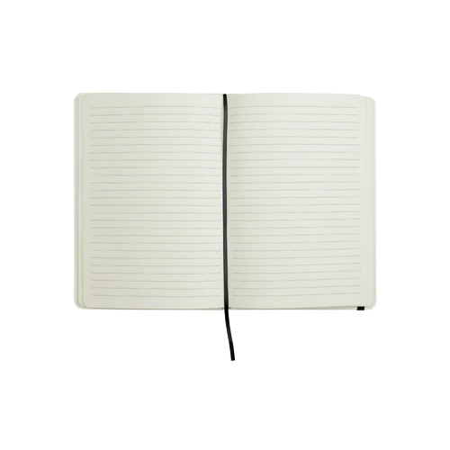 21 x 14,5 x 1 cm. Cartón. Libreta de tapa dura color blanco. Contiene 80 hojas rayadas, señalador y cierra con banda elástica del mismo color.