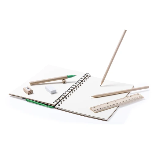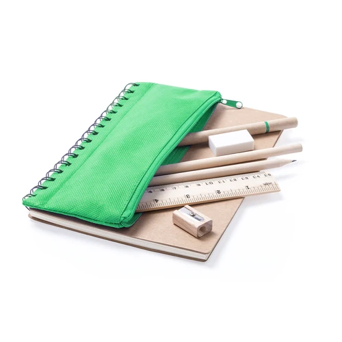 Libreta de anillas con tapas de suave tacto acabadas en resistente cartón reciclado. Con estuche en poliéster 600D de vivos colores y cierre de cremallera integrado en portada. Incluye bolígrafo en cartón reciclado y set de regla, lápices y sacapuntas en madera natural. 70 hojas lisas.
