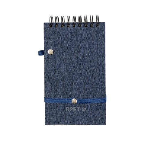 Libreta de anillas con soporte elaborado en RPET 300D y bambú. Sus tapas rígidas destacan por un versátil soporte integrado para smartphone, fabricado en bambú. Además, cuenta con elástico de cierre y soporte para bolígrafo a juego. Contiene 80 hojas interiores lisas y está disponible en una variada gama de colores. Con logotipo RPET en contraportada y presentada en bolsa individual reciclada.El material RPET se elabora a partir de plástico reciclado, para así fomentar la reutilización de residuos plásticos y ayudar a la sostenibilidad del planeta.