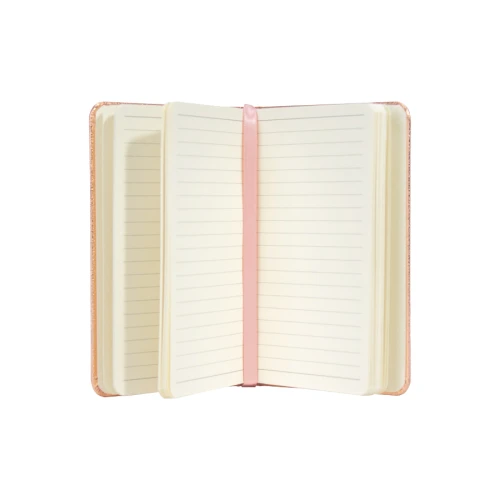 Libreta tamaño A6, con cubierta de cartón piedra forrada en PU color cobre de 1.5mm de espesor, interior 80 hojas amarillas lineadas de 80 gsm. Incluye banda elástica y huincha separador de hojas al tono. Presentación individual en bolsa de polipropileno translúcido.
