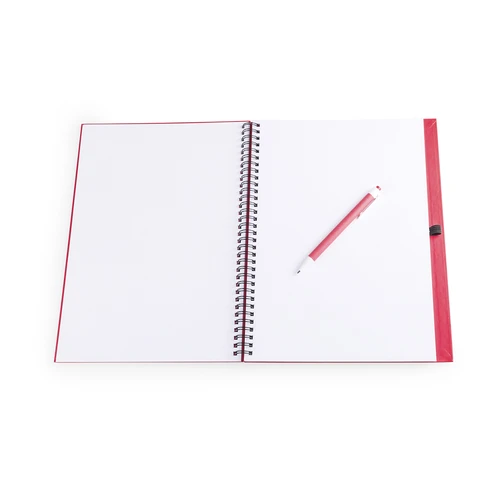 Libreta de anillas con tapas de suave tacto acabadas en resistente cartón reciclado y bolígrafo en cartón reciclado a juego. De atrevidos colores, 80 hojas lisas y con soporte para bolígrafo en contraportada.