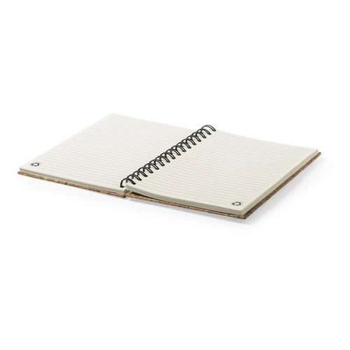 Libreta de anillas en línea nature. Con tapas rígidas en corcho natural y elástico de cierre en color negro. De 100 hojas con diseño eco y disposición a una raya.