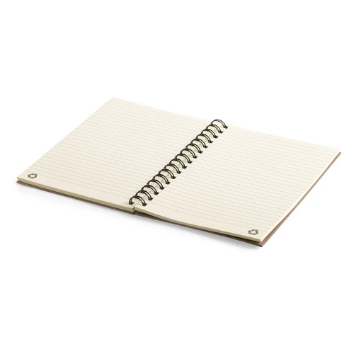 Libreta con anillas de color en línea nature. Con tapas rígidas en cartón reciclado y elástico de cierre en colores naturales. Con 80 hojas de disposición a una raya y diseño eco.