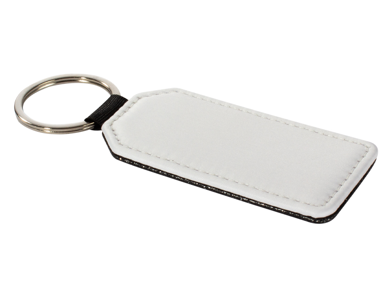 Llavero rectangular con forma "bandera" de PU blanco para sublimación. Reverso capa PU negro con brillo (no sublimable). Argolla de Acero inoxidable.