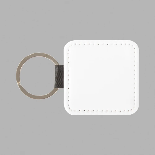 Llavero cuadrado de PU blanco para sublimación. Reverso capa PU negro con brillo (no sublimable). Argolla de Acero inoxidable.