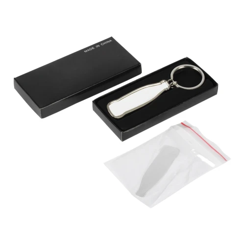 Llavero-destapador metálico con forma de botella de bebida gaseosa, para Sublimación. Incluye argolla llavero de Acero inoxidable. Presentación en estuche negro con cama aterciopelada negra.