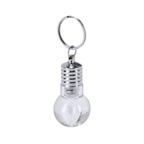 Llavero linterna con original diseño en forma de bombilla. Con 1 LED alimentado con pilas de botón (incluidas) con botón on/off en lateral y elementos decorativos y anilla cromados.