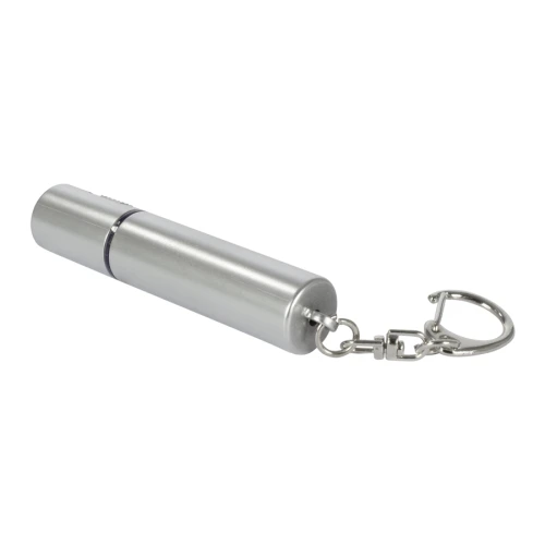 Llavero-Linterna LED plástica color plata. Usa 1 pila botón (incluida).