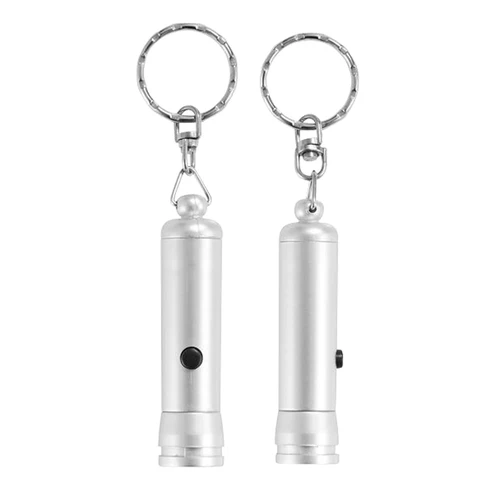 Llavero Linterna plástico color plata, con luz LED. Contiene 3 pilas tipo botón. NOTA IMPORTANTE: Para activar linterna, debes retirar las pilas y sacar cartoncito redondo blanco de seguridad, luego volver a poner las pilas.