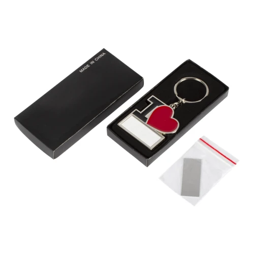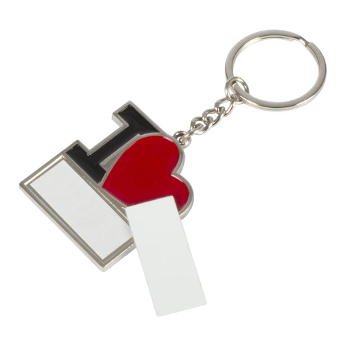 Llavero metálico "I♥", para Sublimación. Incluye argolla llavero de Acero inoxidable. Presentación en estuche negro con cama aterciopelada negra.
