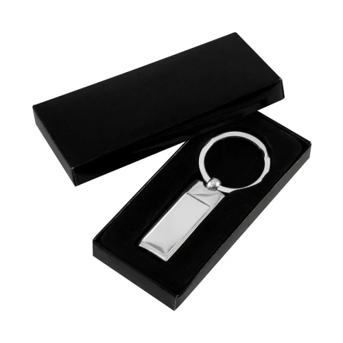 Llavero Metálico Rectangular. Presentación en estuche laminado negro con cuna aterciopelada.