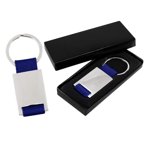 Llavero Metálico "Strap" con huincha de polyester de color. Presentación en estuche laminado negro con cuna aterciopelada.