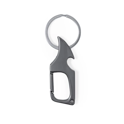 Práctico llavero abridor metálico. Con anilla para llavero y mosquetón para un rápido enganche. Con abrebotellas en uno de sus extremos, incorpora un pequeño cuchillo de acero inox en el extremo opuesto, ideal para abrir cartas, paquetes, etc. En elegante color negro metalizado y presentado en bolsa de papel reciclada.