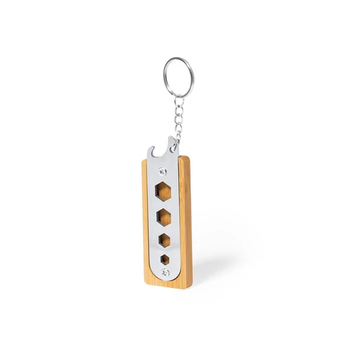 Llavero multiherramienta fabricado en resistente acero inox y bambú. Con práctico conjunto de 4 llaves fijas hexagonales troqueladas y abrebotellas. Presentado en caja individual de diseño kraft.