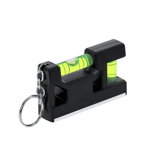 Llavero nivel multifunción magnético en base fabricado en ABS. Con regla de escala en centímetros. Nivel en posición horizontal y vertical. Con anilla metálica cromada. De tamaño compacto.