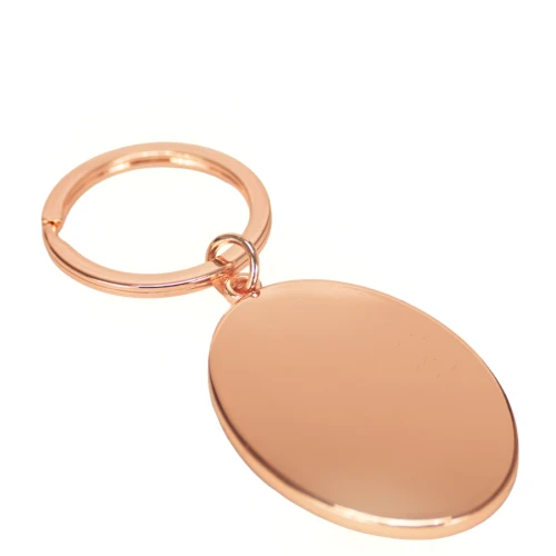 Llavero metálico ovalado de zinc alloy encobrizado, con placa interior de aluminio negro. Presentación en elegante estuche laminado negro mate, con cuna aterciopelada negra.