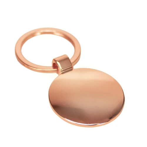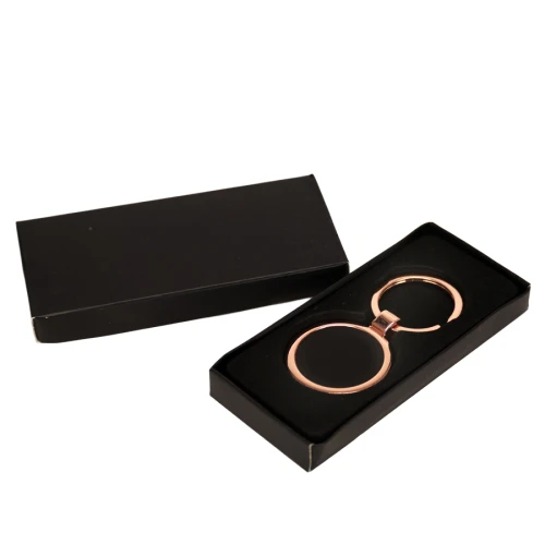 Llavero metálico redondo de zinc alloy encobrizado, con placa interior de aluminio negro. Presentación en elegante estuche laminado negro mate, con cuna aterciopelada negra.