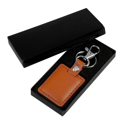Llavero de simil Eco-cuero Café + Mosquetón Metálico. Presentación en estuche laminado negro con cuna aterciopelada.