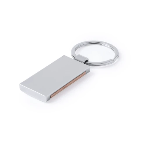 Llavero en combinación de materiales metal de acabado brillante y madera natural. Con amplia superficie para marcaje y presentado en bolsita con refuerzo de cartón en color plateado. Disponible en diseños circular y rectangular.
