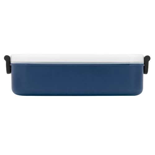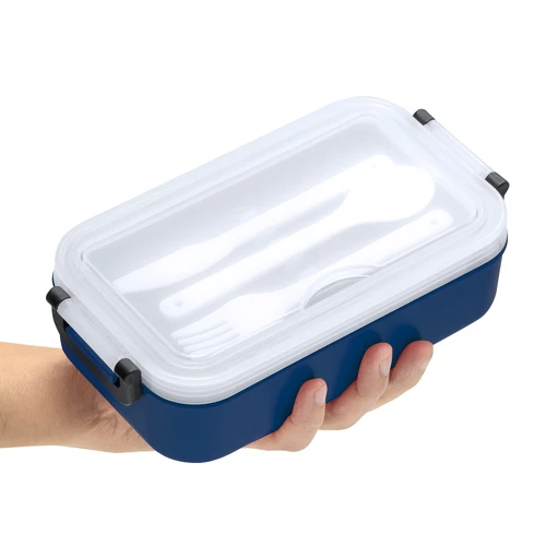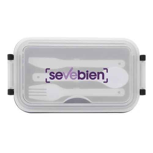 11,5 x 5,8 x 21,5 cm. Plástico Polipropileno. Contenedor de alimentos. Tapa translúcida con bandeja porta cubiertos, anillo de silicona antiderrame y ajustes de seguridad en sus laterales. Set de 3 cubiertos plásticos de color blanco (tenedor, cuchillo, cuchara) de 15 cm de largo.