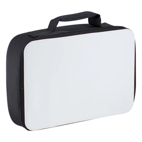 Lonchera de Microfibra, con interior cooler con aislante térmico plateado. Incluye mango y tapa dura en tela blanca para Sublimación a todo color. Cierre eclair.