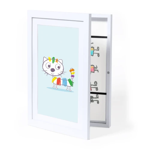 Elegante marco de arte que combina funcionalidad y estilo. Ofrece un compartimento para almacenar diseños de tamaño A4 sujetos por bandas elásticas, mientras que en su portada incorpora un marco para resaltar el diseño elegido. Se destaca por su apertura de bisagras y cierre magnético, garantizando un manejo práctico y seguro. Presentado de forma individual en caja de diseño kraft.