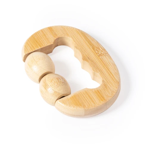 Masajeador de línea nature, fabricado en en bambú. Con 2 bolitas masajeadoras a juego y asa ergonomica. Presentación en caja individual de diseño kraft.