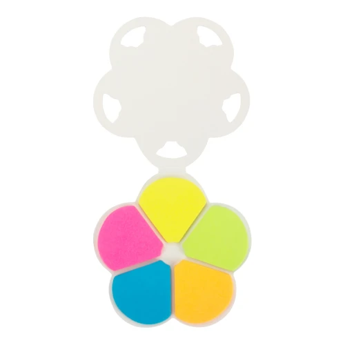 Memo set Ecológico con tapa y contra-tapa de cartulina blanca reciclada. Incluye 150 banderitas adhesivas de colores con forma de pétalo de flor.