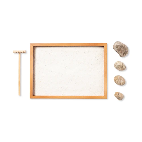 Mini jardín Zen para la relajación y paz interior. Base contenedora y rastrillo fabricados en madera natural, con 4 piedras naturales y saquito de arena blanca. Presentación en caja individual de diseño kraft.