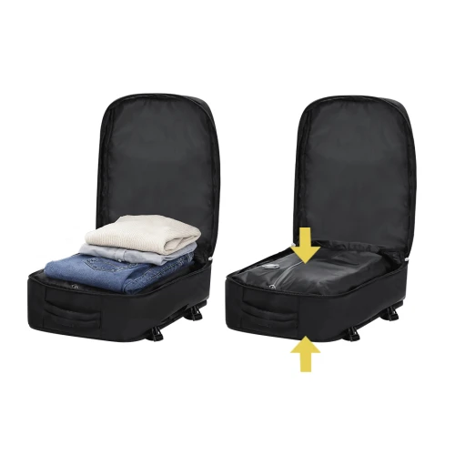 Mochila al vacío con elegante diseño en suave nylon incluye bomba de vacío de 35W. Cuenta con un compartimento principal extensible, en él se encuentra un bolsillo interior de vacío. El tercer compartimento dispone de un bolsillo con múltiples opciones de almacenamiento. Además de dos bolsillos de pequeño tamaño en la parte frontal. Laterales con hebillas para ajuste. Espalda y cintas acolchadas, y cinta para trolley. Asa de agarre y en la parte superior.