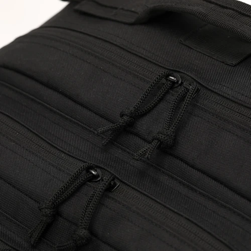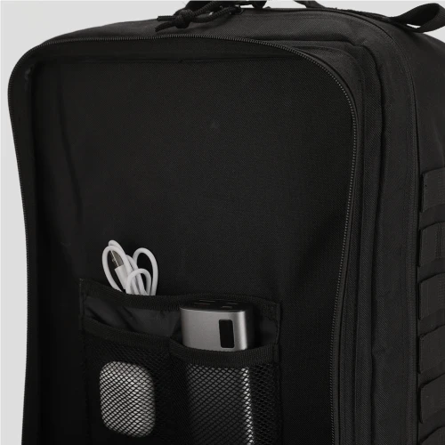 Mochila táctica en resistente poliéster RPET 600D. Parte frontal con múltiples bolsillos, además de soportes elásticos y velcros para colgar los accesorios necesarios durante la aventura. Compartimento principal con cierre de cremallera de doble tirador y bolsillos interiores con varios compartimentos, con capacidad para portátil de 17 pulgadas. Incluye esquinas reforzadas y asa de transporte. Con espalda y cintas de hombros acolchadas y ajustables, y correas frontales para mayor comodidad. Etiqueta con distintivo de RPET.El material RPET se elabora a partir de plástico reciclado, para así fomentar la reutilización de residuos plásticos y ayudar a la sostenibilidad del planeta.