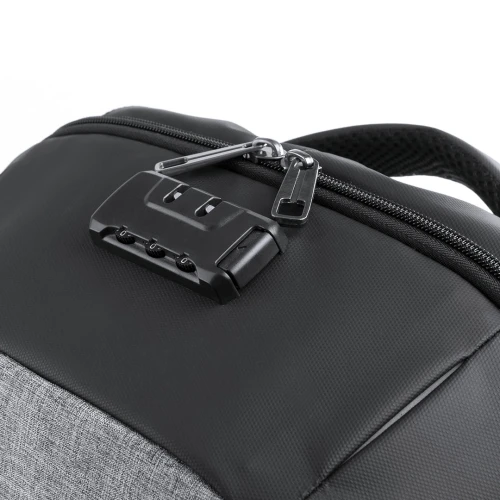 Mochila cargador con panel de carga solar en resistente poliéster 1200D. Resistente al agua, con salida USB para carga -powerbank no incluido- y cierre de seguridad con contraseña. Compartimento principal con doble tirador, con bolsillo acolchado para ordenador portátil de hasta 15 pulgadas y tablet de hasta 10 pulgadas. Cintas de hombros y espalda con acolchado ergonómico.