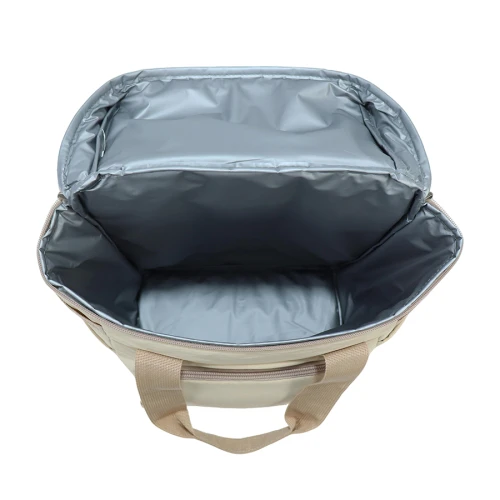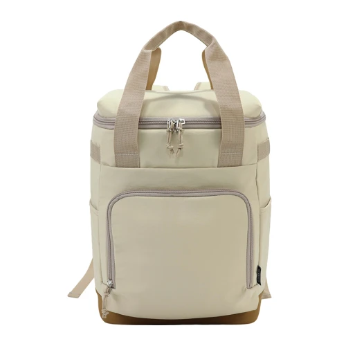 Mochila cooler con exterior "GREENLAND" de tela PET reciclada (RPET) color beige e interior térmico aislante de PEVA y acolchado con esponja PE FOAM. Incluye bolsillo delantero, 2 bolsillos laterales, mango y cierre-eclair con apertura 240°. Base de Nylon Ripstop impermeable color café. Capacidad 16L.