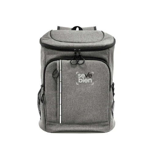43 x 29 x 18 cm. Capacidad 18 litros aprox. Poliéster Wulong 300D + Interior forrado en PEVA color plata con relleno de espuma de PE. Mochila cooler. Compartimento principal con cierre en la parte superior. Compartimento frontal con cierre, bolsillo interno de red con cierre y bolsillo externo vertical con cierre y banda reflectante. Dos bolsillos laterales de red multipropósito. Incluye destapador de botellas de acero inoxidable (6,3 x 3,3 cm) extraíble. Correas regulables acolchadas. Cierres metálicos. Tiradores de cierre plásticos en forma de U de color negro.