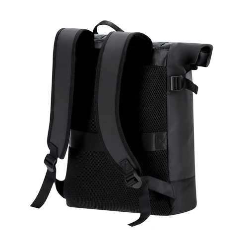Mochila confeccionada en suave PVC con sistema de cierre enrollable y hebillas. Dispone de un bolsillo con cremallera. Interior de gran capacidad con compartimento acolchado para portátil de hasta 15 pulgadas y Tablet de 10”. Cintas laterales ajustables que permiten compactar el volumen según necesidad. Cintas de hombros en PU y espalda acolchadas para mayor comodidad. Incluye cinta trasera para ajuste en trolley o maleta, ideal para viajes y desplazamientos.