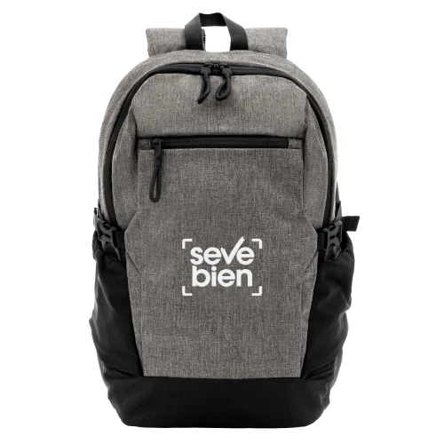 30 x 45 x 17 cm. Capacidad 23 litros aprox. Sarga de algodón y Poliéster. Mochila portanotebook. Compartimento principal con cierre. Interior forrado impreso con logo Nomawalk, con división acolchada porta notebook de hasta 16 pulgadas y bolsillo de red con cierre. Bolsillo frontal horizontal con cierre y dos bolsillos de lycra laterales porta botellas y accesorios, con cintas de amarre. Correas regulables y espalda con red para ventilación, ambas acolchadas. Cierres metálicos con tiradores de cordón.