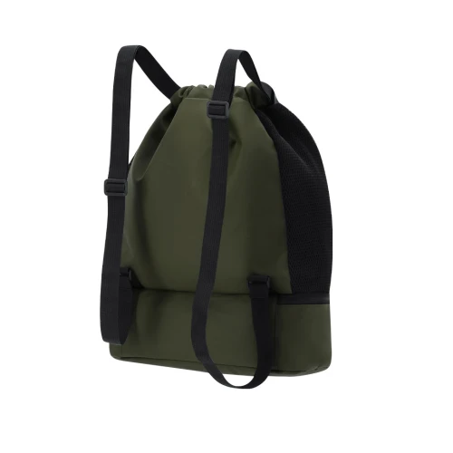 Mochila en suave PU con compartimento principal con cierre de cuerdas y pequeño bolsillo interior con cierre de cremallera. Incluye bolsillo en la base para zapatos con cierre de doble cremallera y bolsillos frontales con cierre de cremallera de rápido acceso. Con laterales transpirables y asas para los hombros ajustables.