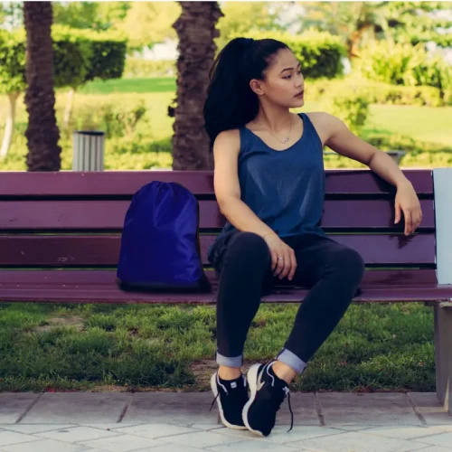 Mochila de polyester. Cierre y correas de cordón. Ojales metálicos. Capacidad: 3,8 Lts. Medidas: 34,5 x 44,5 cm.