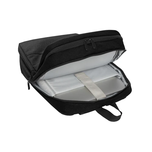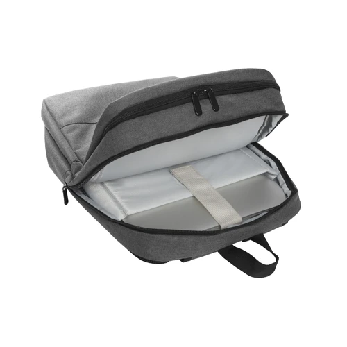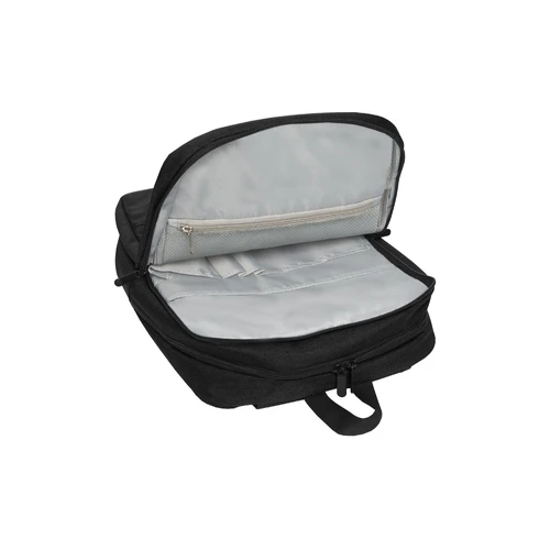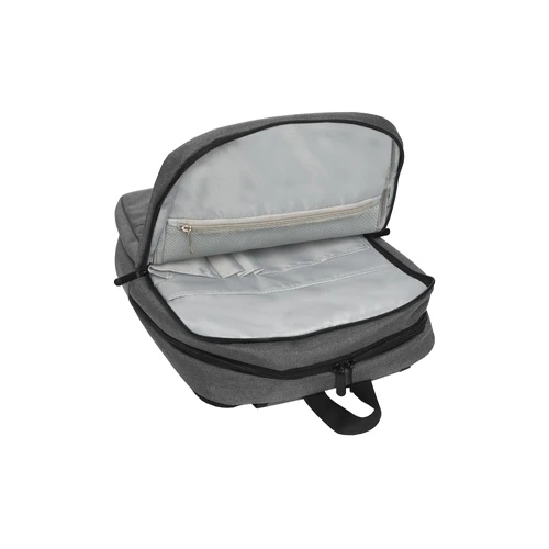 28 x 42 x 12 cm. Capacidad 14 litros aprox. Tela de yute - imitación. Poliéster 100%. Mochila portanotebook de hasta 16 pulgadas. Amplio bolsillo frontal con cierre lateral. Posee 2 compartimentos acolchados y forrados. El primero con un bolsillo de red con cierre, organizador con pequeños bolsillos, porta boligrafos y espacio para guardar una tablet. El segundo compartimento contiene bolsillo para notebook de hasta 15". Correas ajustables y espalda acolchadas con tela de red que permite la ventilación. Tiradores de cierres metálicos.
