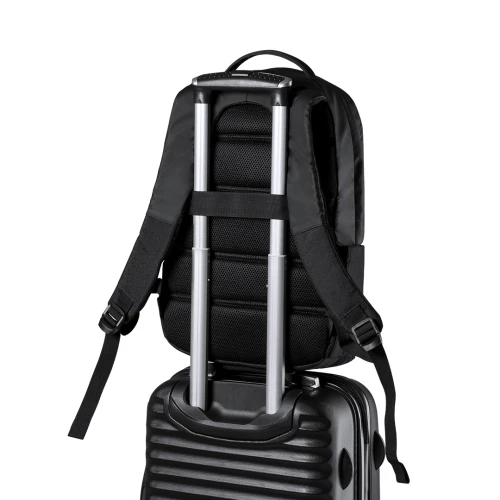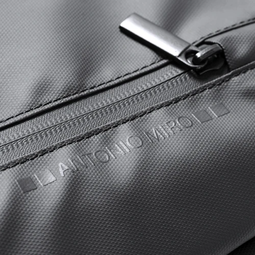 Mochila de Antonio Miró de calidad premium en resistente poliéster 600D de sobrio diseño en color negro. Con cierre de cremallera, bolsillo frontal y asa reforzada metálica. Con acolchado ergonómico en espalda y cintas de hombros, incluye compartimento interior acolchado para portátil de hasta 15 pulgadas y para tablets de hasta 10 pulgadas. Fundas interiores para bolígrafos y smartphone. Con logotipo de la marca en frontal.