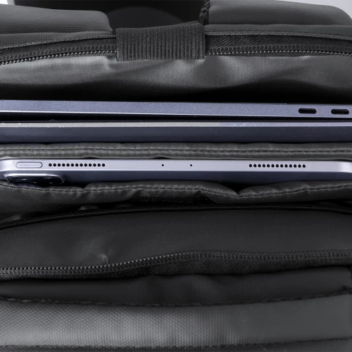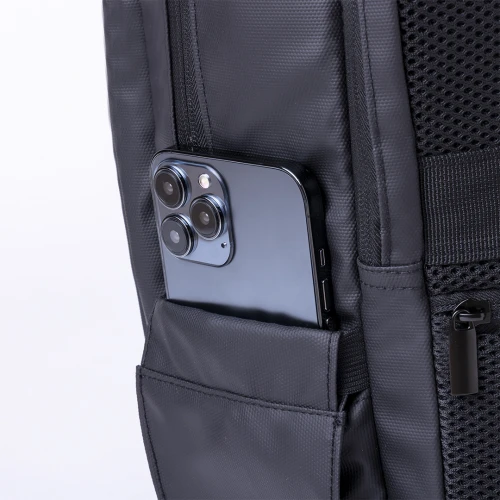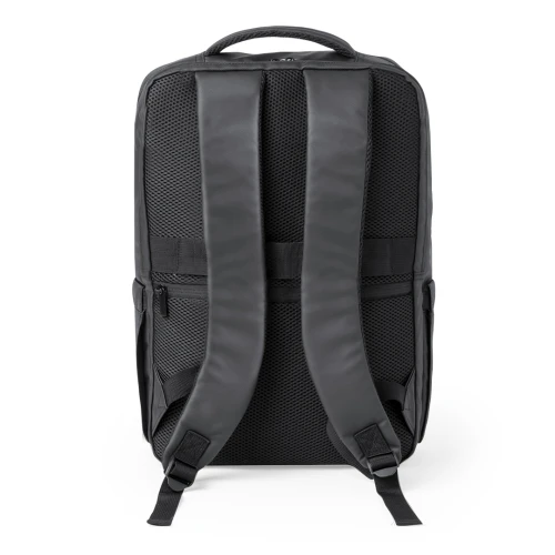 Mochila de Antonio Miró de calidad premium en resistente polipiel de sobrio diseño en color negro. Con cierre de cremallera doble, bolsillo frontal y asa reforzada acolchada. Con acolchado ergonómico en espalda y cintas de hombros, incluye compartimento interior acolchado para portátil de hasta 15 pulgadas y para tablets de hasta 10 pulgadas. Además, con bolsillo antirrobo con cierre de cremallera en la parte trasera. Fundas interiores para bolígrafos y smartphone. Con logotipo de la marca en frontal.
